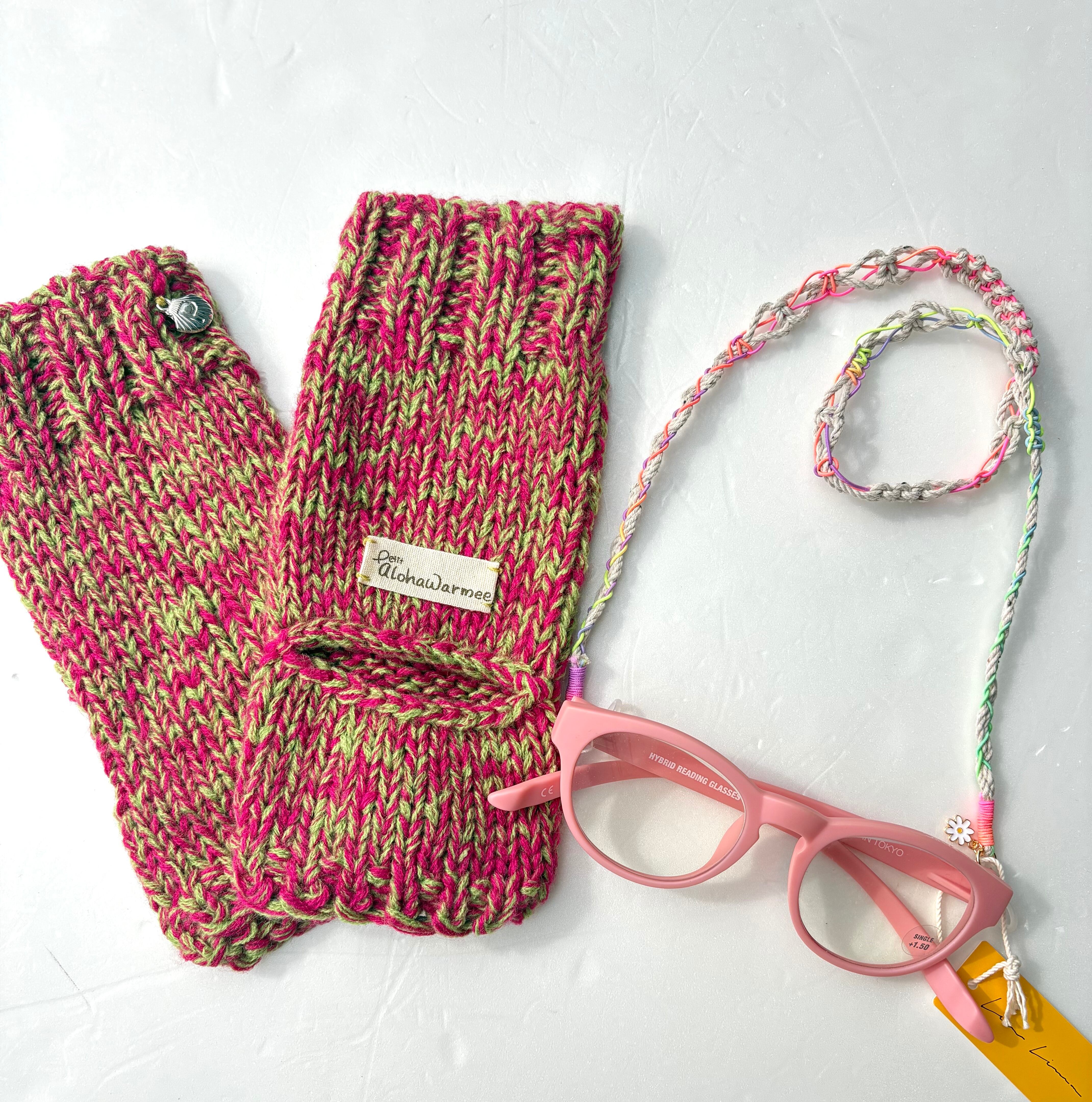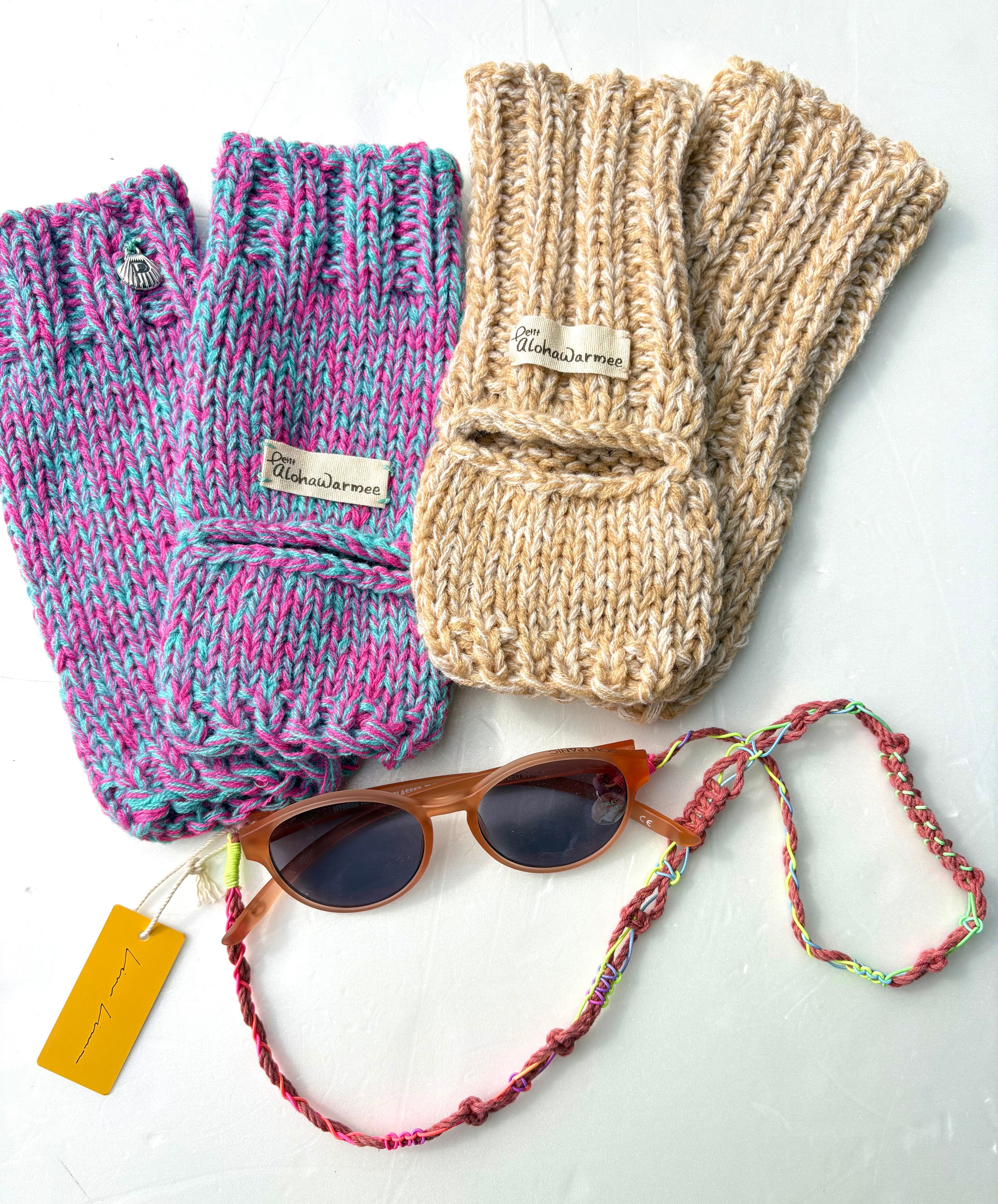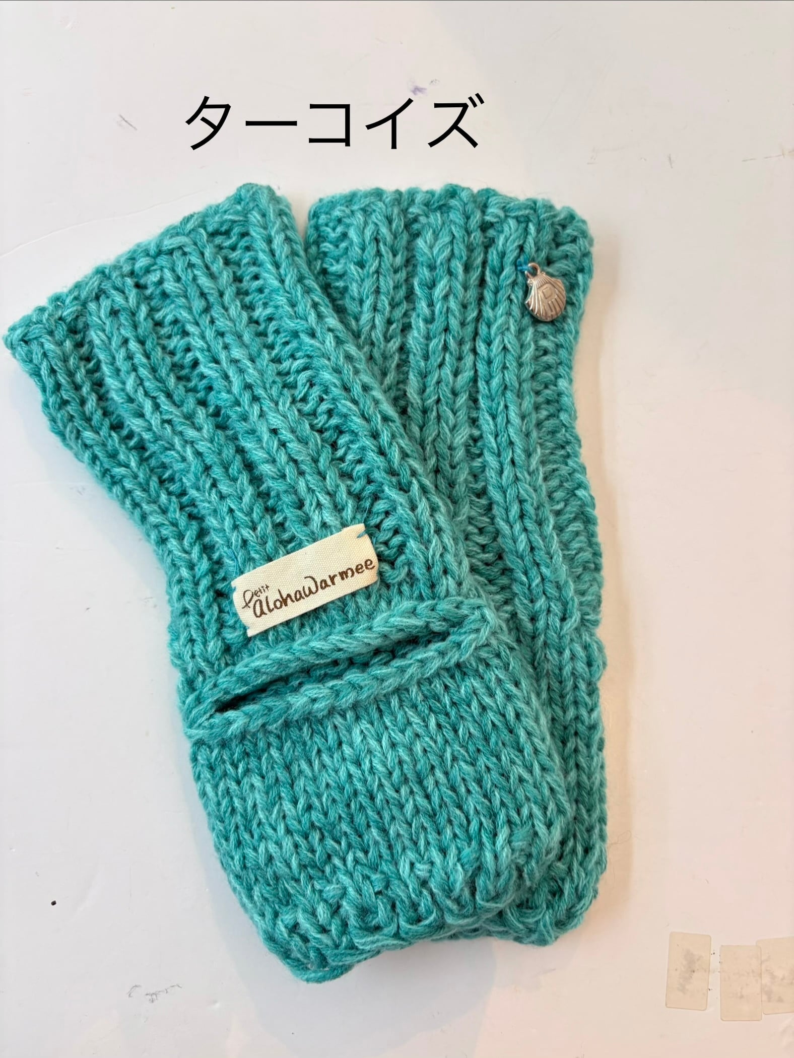 伸びにくいように編み方と端にゴムを入れています。今まで同様片方にかわいいシェルのチャームがついています。